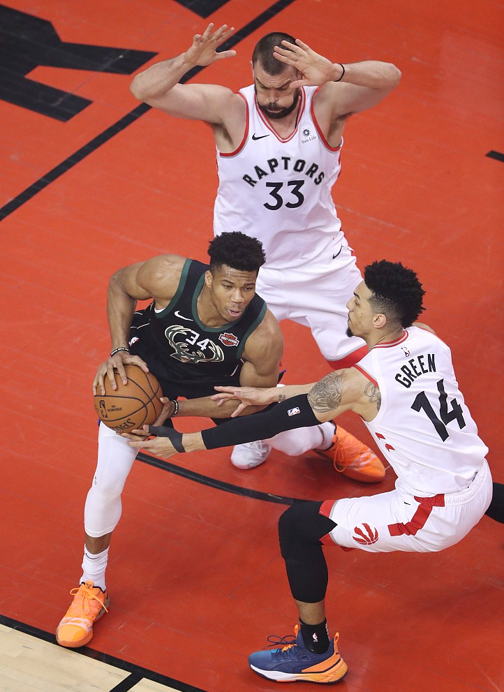 Marc Gasol #33 and Danny Green #14 of the Toronto Raptors double team Giannis Antetokounmpo of the Milwaukee Bucks in the game. /VCG Photo