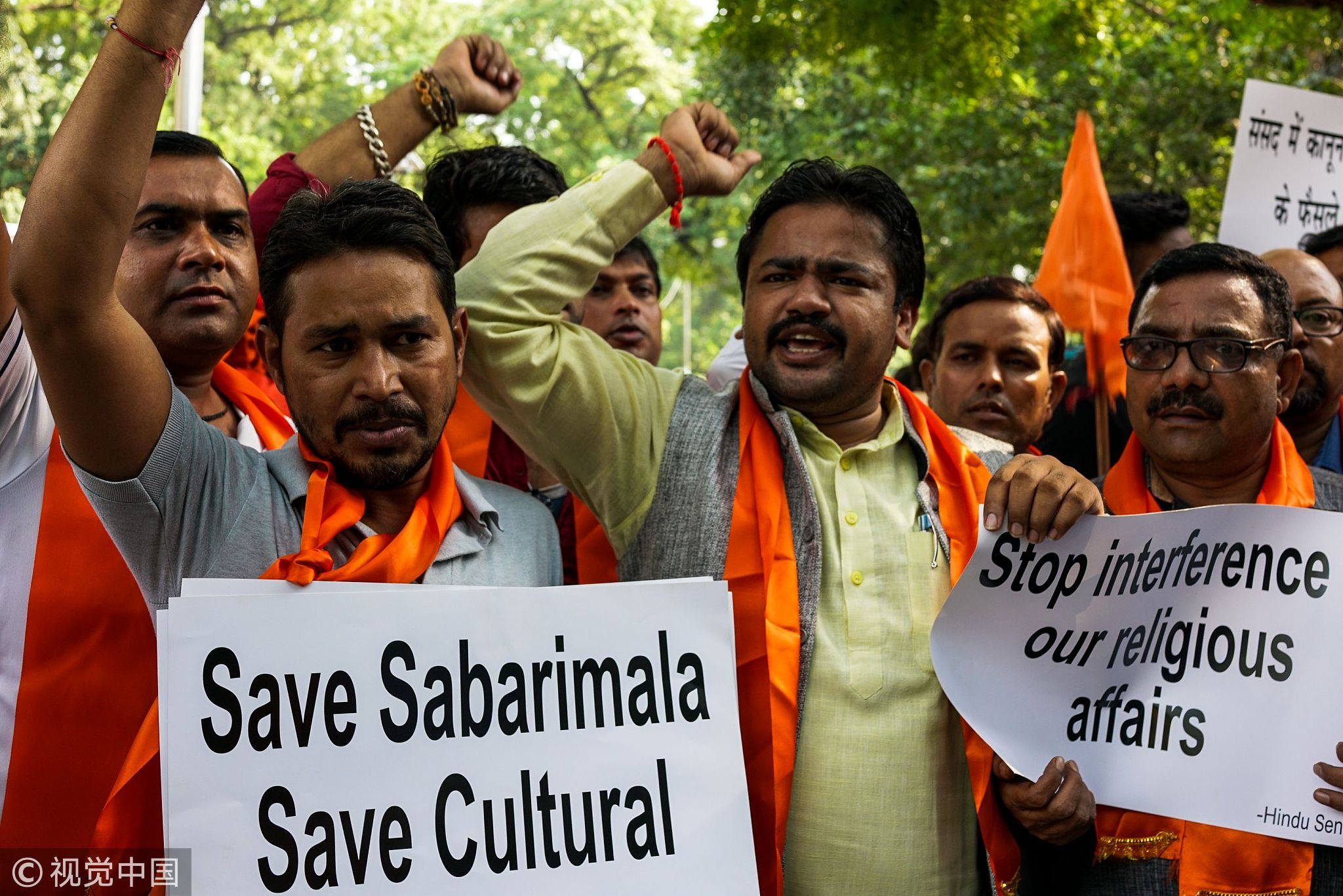 Members of the Hindu Sena outfit shout slogans as they protest against the Supreme Court decision to allow women of all ages to enter inside the Kerala's Sabarimala temple, in New Delhi, October 4, 2018. /VCG Photo