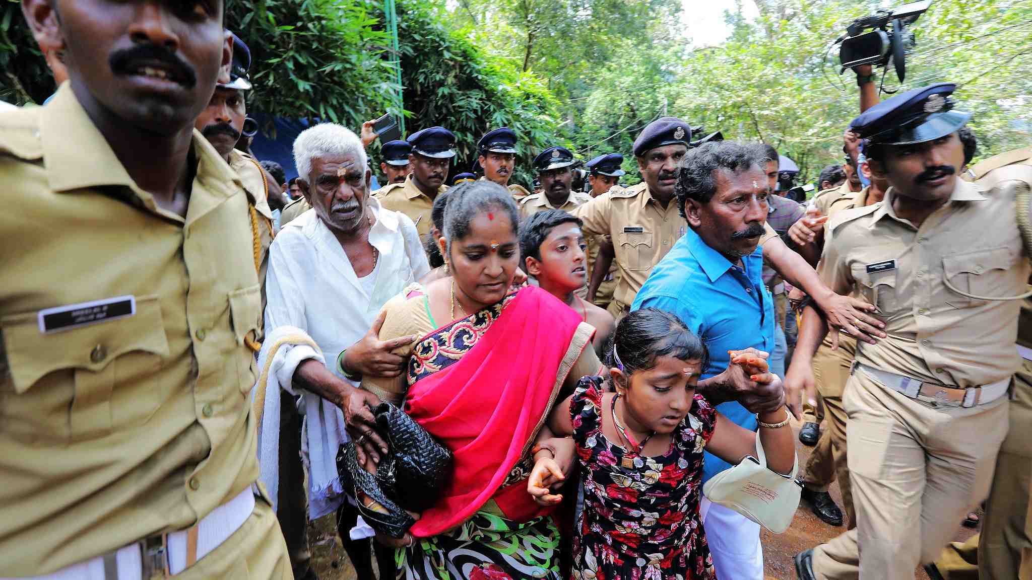 Police escort Madhavi (of the neighboring Andhra Pradesh state) and her family members after she was heckled by the protesters while she was seeking the entry to the Lord Ayyappa Temple on its opening day in Sabarimala, Kerala, India, October 17, 2018./VCG Photo