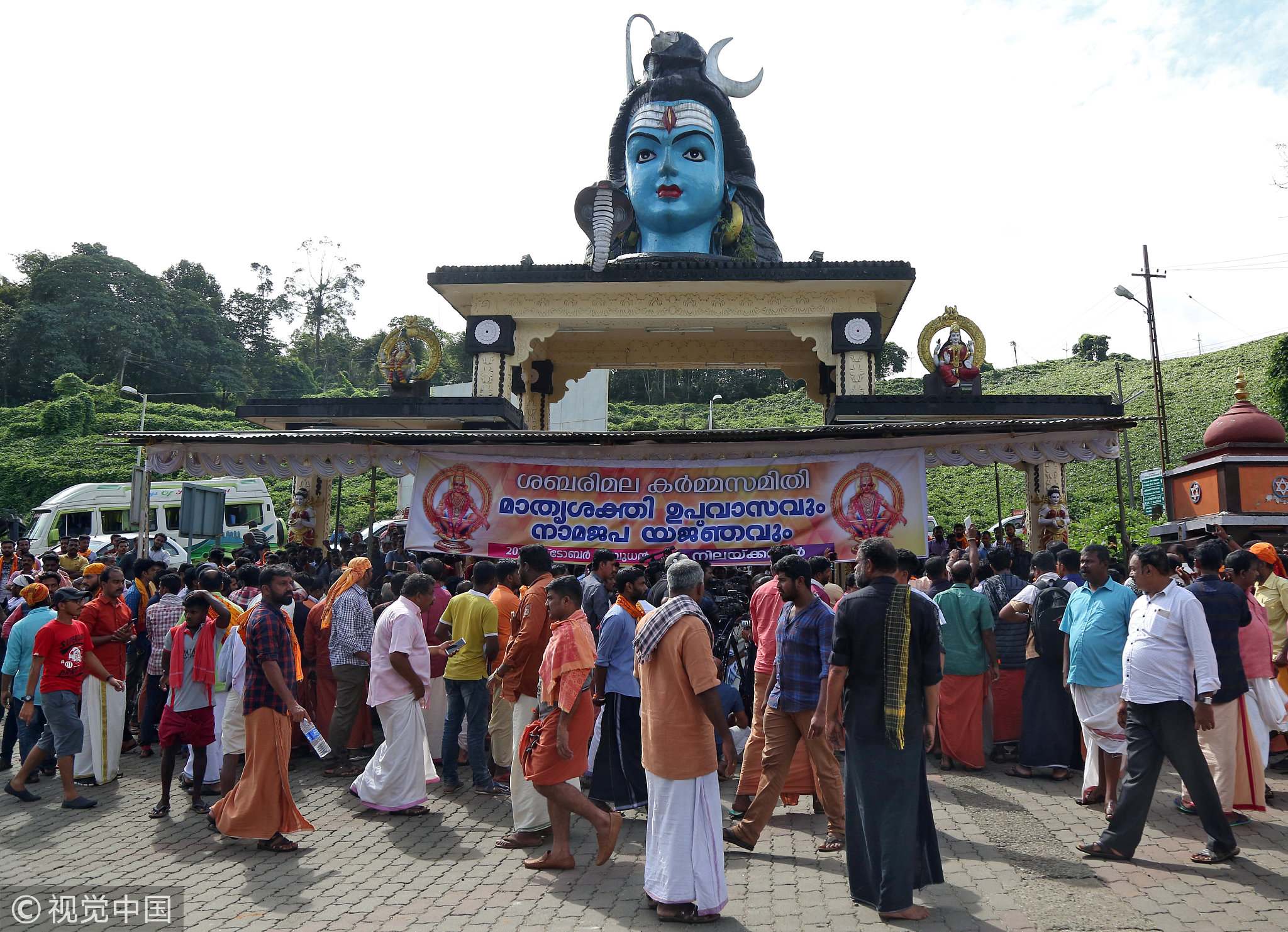 Devotees gather at a temple during a protest against the lifting of the ban by Supreme Court that allowed entry of women of menstruating age to the Sabarimala temple, at the Nilakkal Base Camp in Pathanamthitta district in the southern state of Kerala, India, October 17, 2018./VCG Photo