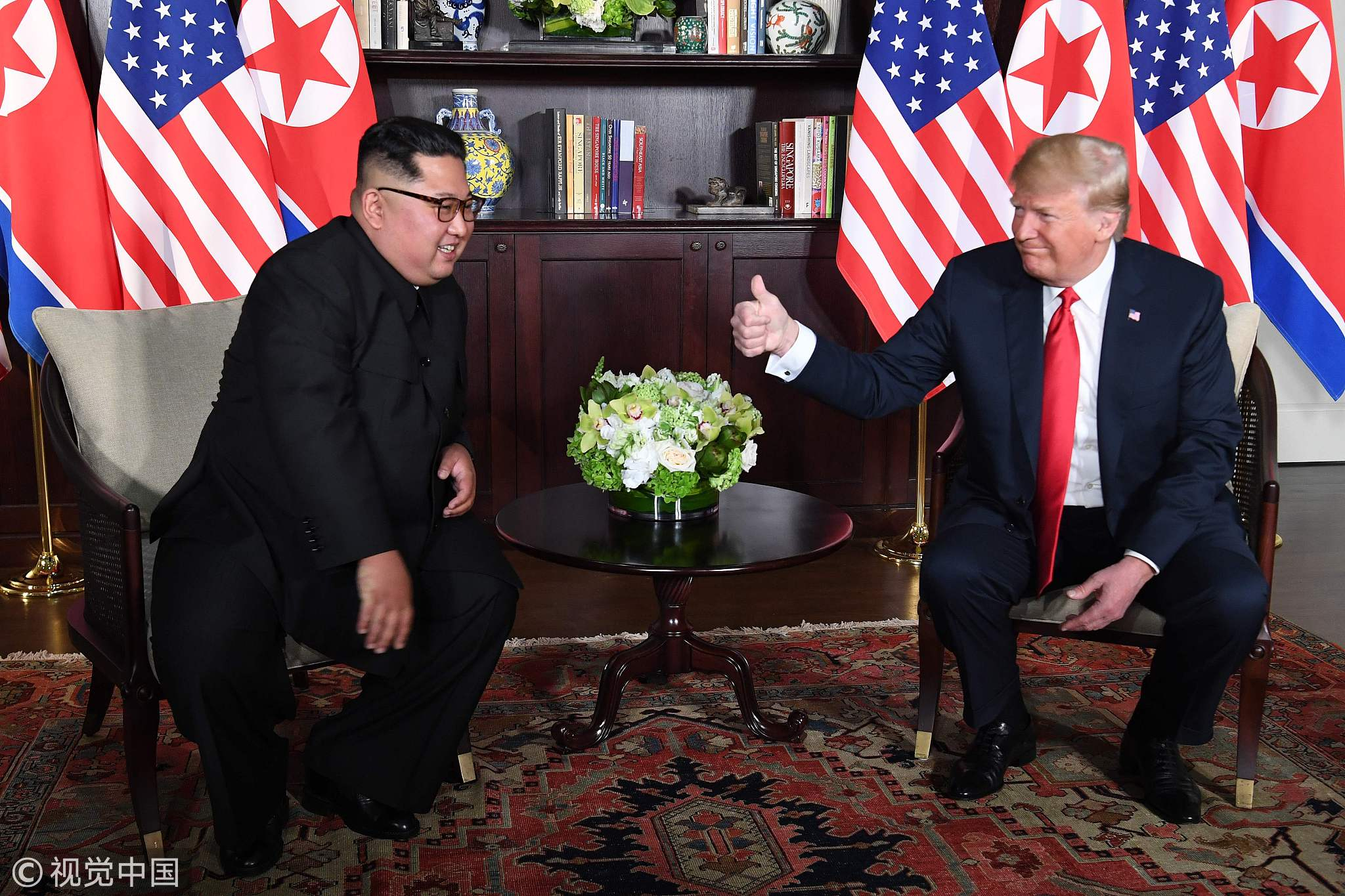 US President Donald Trump (R) gives a thumbs up as he sits down with DPRK leader Kim Jong Un (L) for their historic US-DPRK summit, at the Capella Hotel on Sentosa island in Singapore on June 12, 2018. /VCG Photo