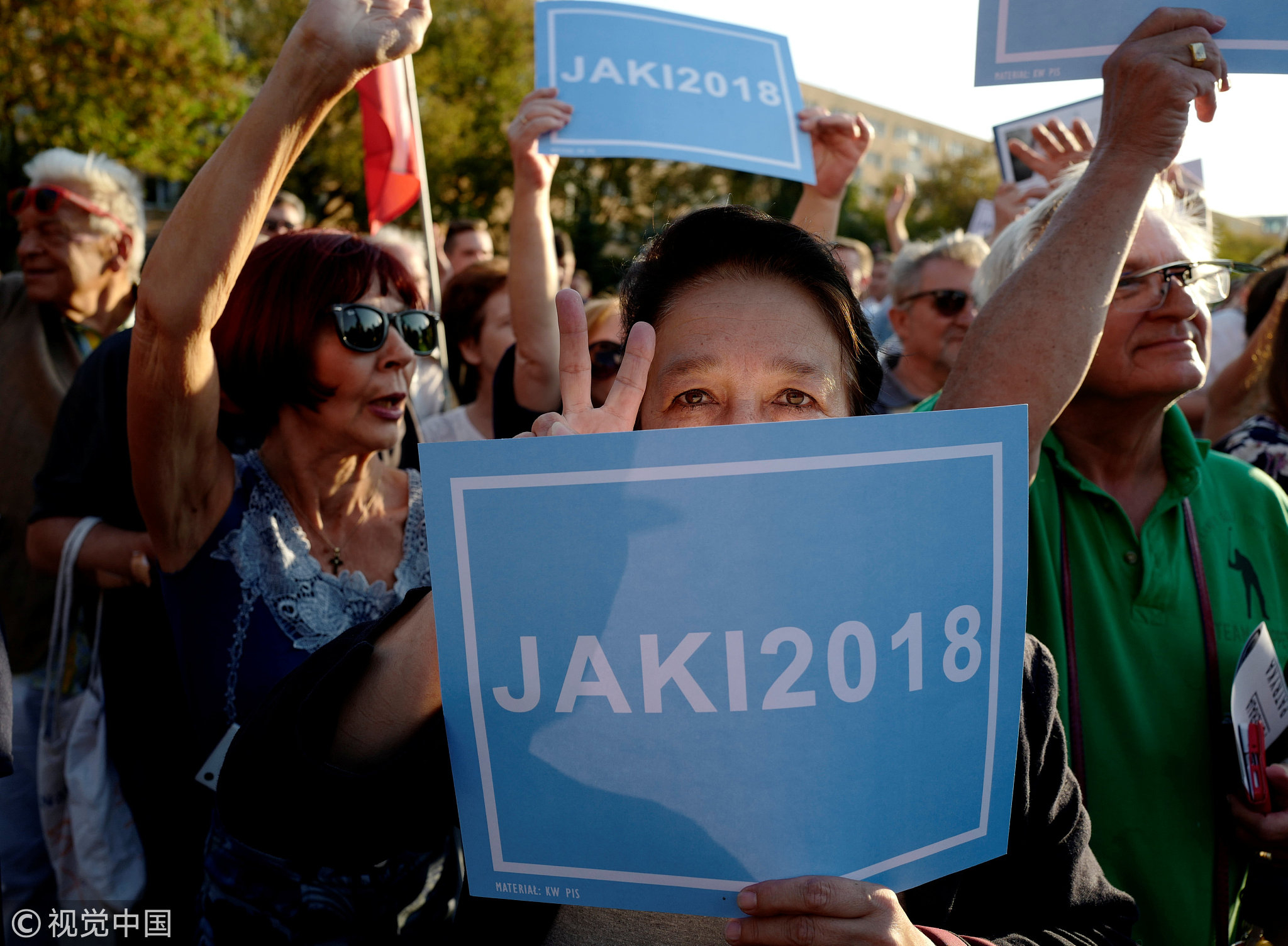 A supporter of Patryk Jaki (PiS) holds a banner during an election meeting in Warsaw, Poland, September 19, 2018. /VCG PHoto