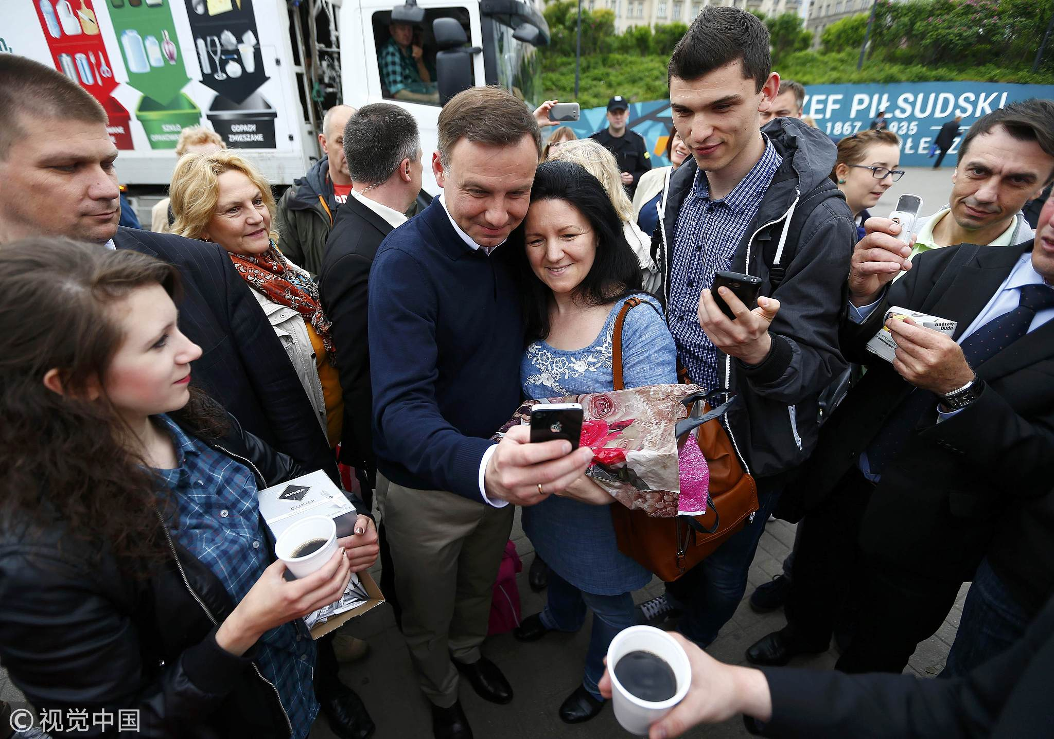 The presidential candidate of the Law and Justice Party (PiS) poses for a picture with passersby outside a subway station in central Warsaw, Poland, May 25, 2015. /VCG Photo