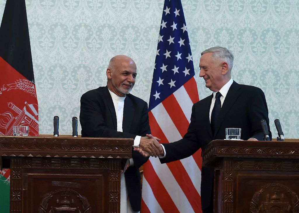 Former U.S. Defense Secretary Jim Mattis (R) shakes hands with Afghan President Ashraf Ghani after a press conference at the Presidential Palace in Kabul, September 27, 2017. /VCG Photo