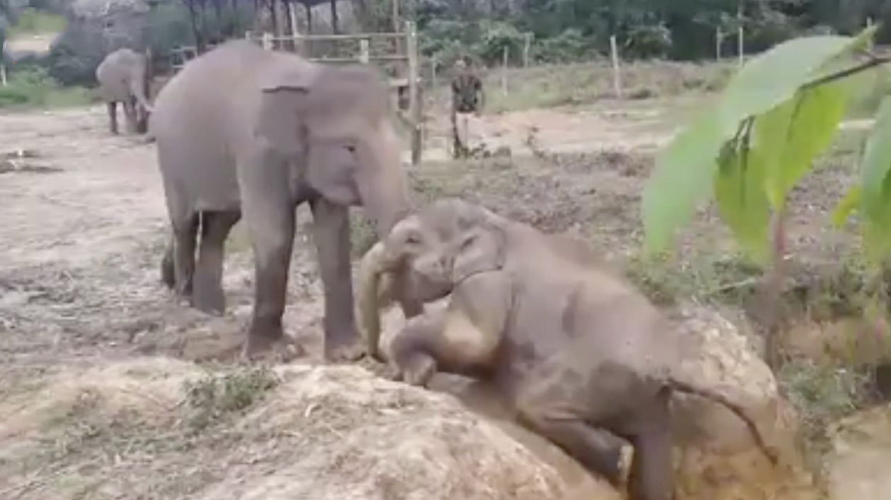 This baby elephant in Indonesia’s Barumun Nagari Wildlife Sanctuary was struggling to climb out of a ditch.Despite its best effort, the calf could not manage to pull itself out. A big elephant was luckily nearby, and jumped into the ditch to give the youngster a much-needed push.