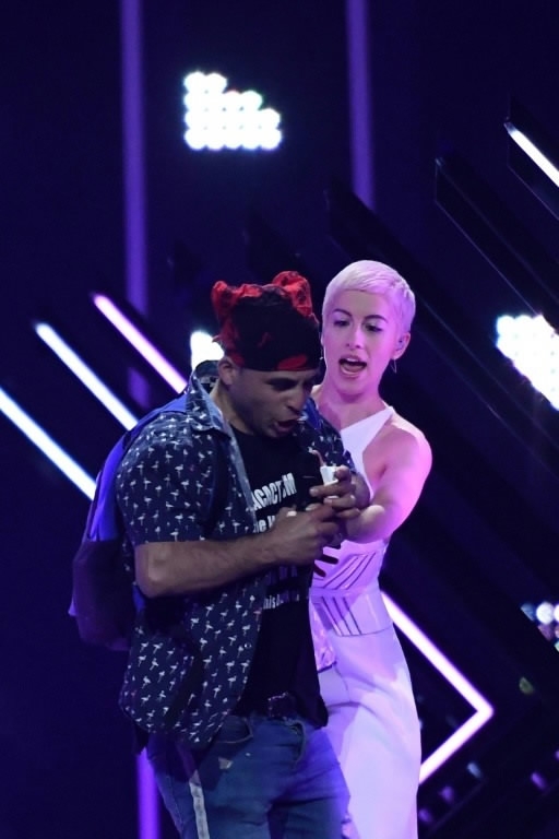 A stage invader seized the microphone from Britain's SuRie during her performance. /AFP Photo