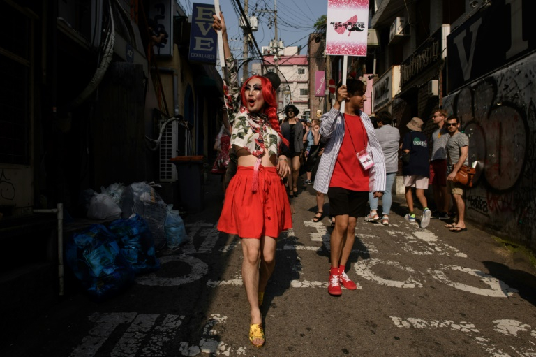Dozens of drag queens and kings marched through Itaewon on Saturday, a suburb of Seoul best known for its nightlife and a nascent but vibrant gay scene.