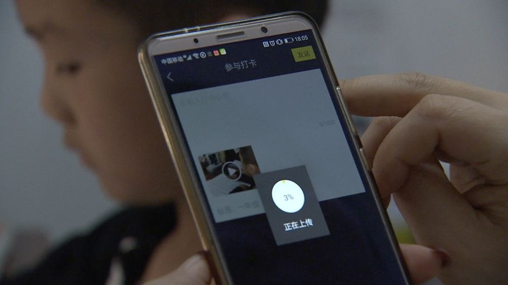 A parent submits her child's reading exercise through an app. /CGTN Photo