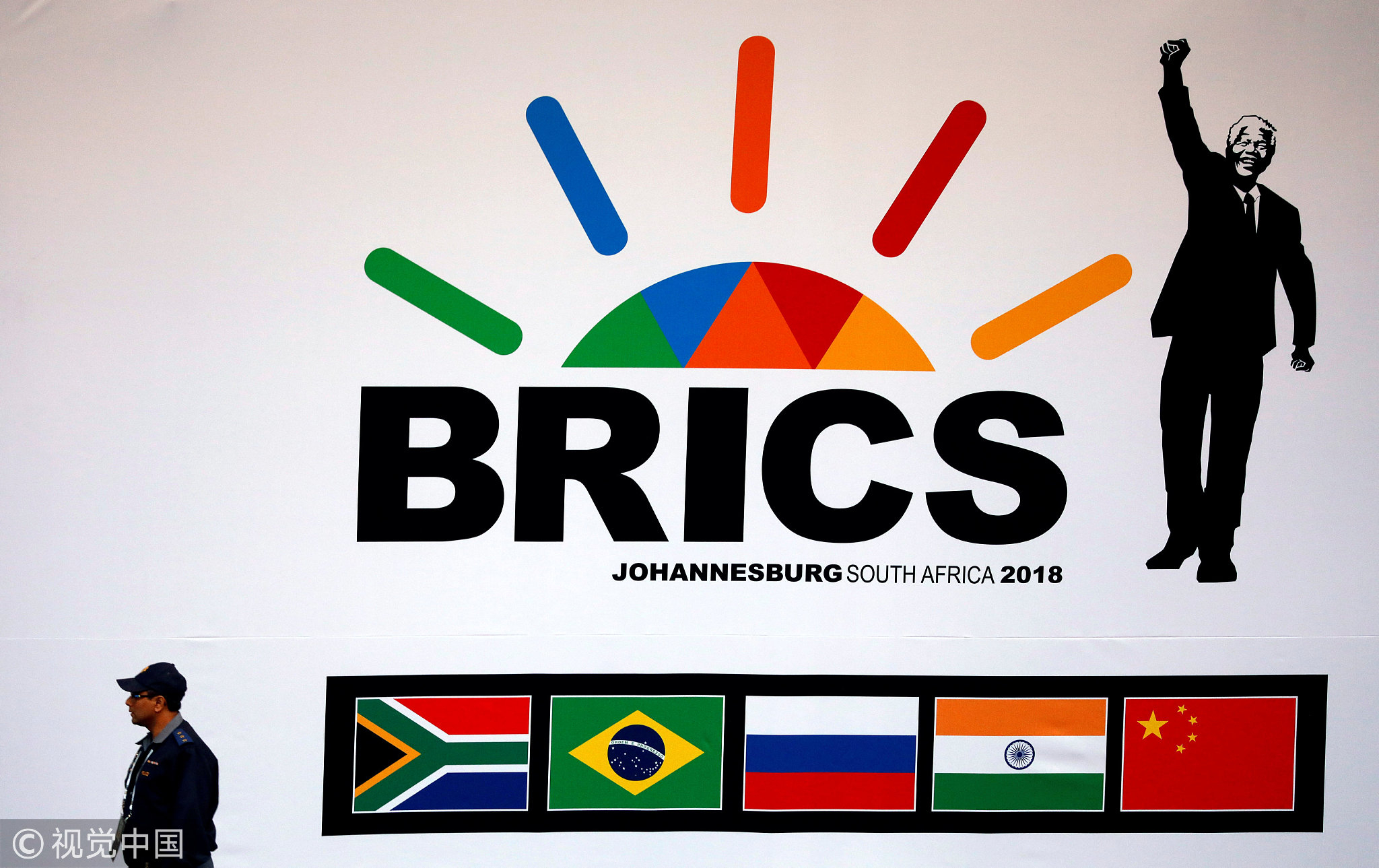 A police officer walks past a billboard outside the BRICS summit meeting in Johannesburg, South Africa, July 25, 2018. /VCG Photo