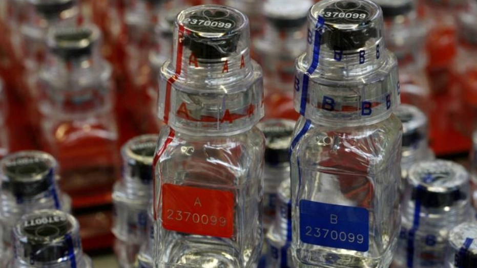 An A and a B bottle, used for the collection of urine samples in doping tests, stand at production site of Swiss Berlinger & Co. AG in Ganterschwil, Switzerland August 15, 2008. / REUTERS File Photo