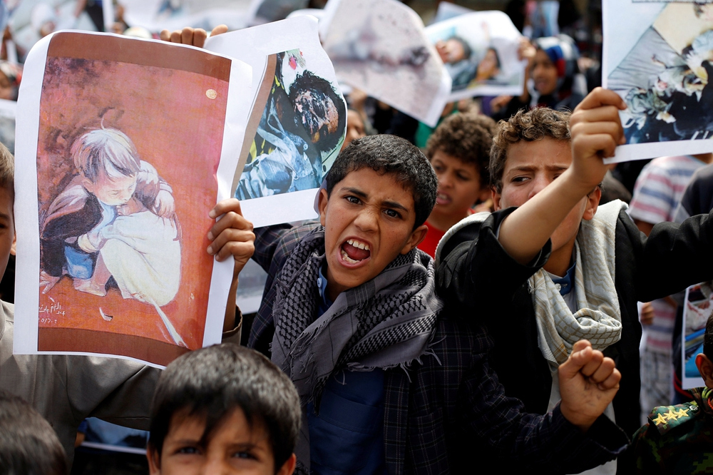 Children demonstrate outside the offices of the United Nations in Sanaa, Yemen, to denounce last week's air strike that killed dozens in the northwestern province of Saada, August 13, 2018. /VCG Photo