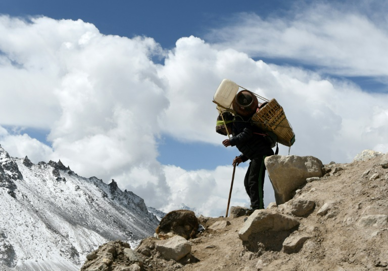 A porter carries supplies to Qomolangma base camp, where bargain operators offer cheaper ways to glory-chasers. /AFP Photo