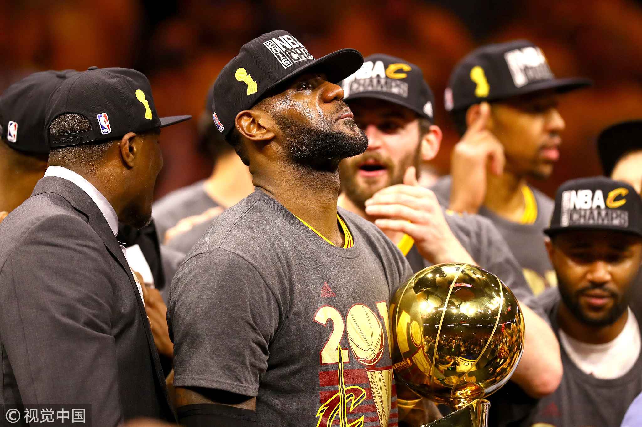 LeBron James #23 of the Cleveland Cavaliers holds the Larry O'Brien Championship Trophy after defeating the Golden State Warriors 93-89 in Game 7 of the 2016 NBA Finals at ORACLE Arena on June 19, 2016 in Oakland, California. /VCG Photo