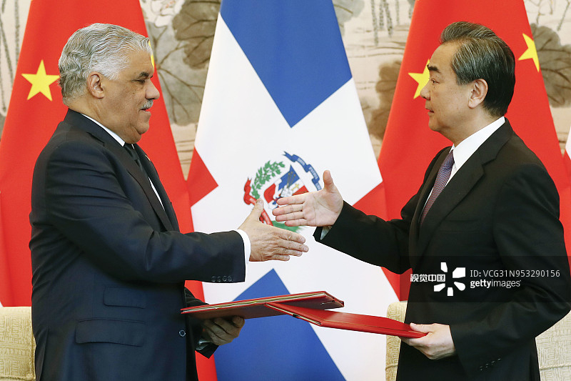 Dominican Republic Foreign Minister Miguel Vargas (L) and Chinese State Councilor and Foreign Minister Wang Yi shake hands at a ceremony in Beijing, May 1, 2018, to announce the establishment of diplomatic relations. /VCG Photo