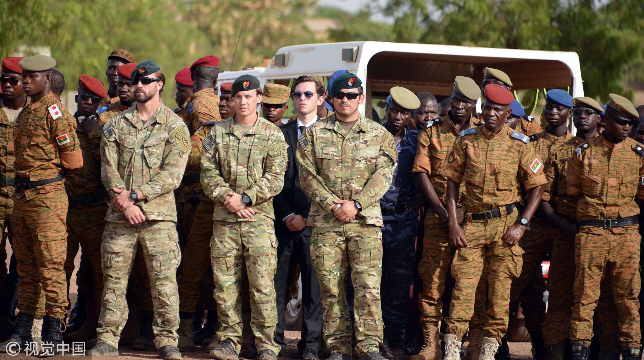 A Burkina Faso's military and foreign military stand guard, May 24, 2018, in Ouagadougou. /VCG Photo