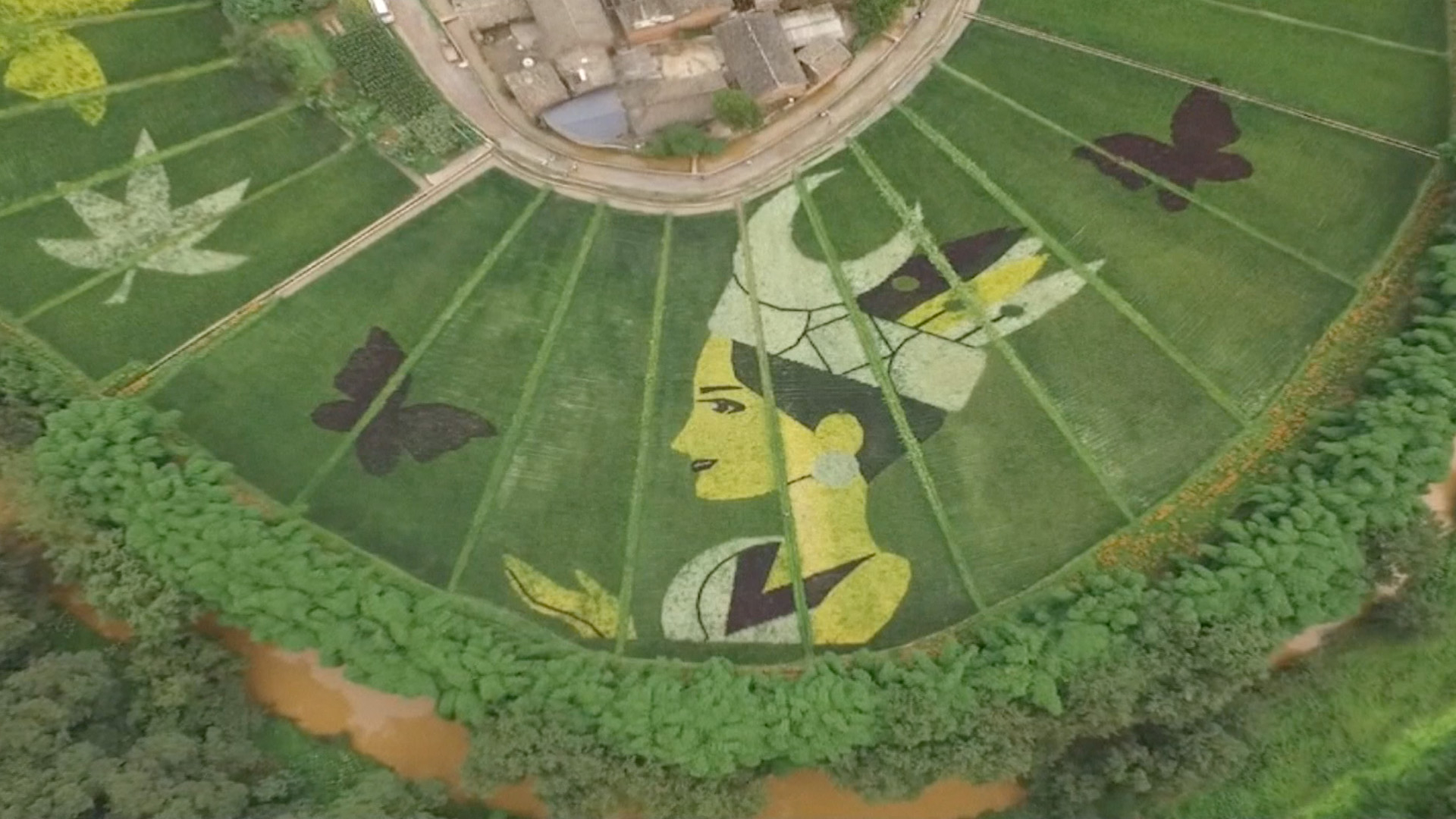 A giant artwork made up of five different colored rice flowers in paddy fields is showcased in Hewan Village. It includes elaborate designs of Niangx Eb Seil, the Miao people's goddess of beauty, as well as butterflies.