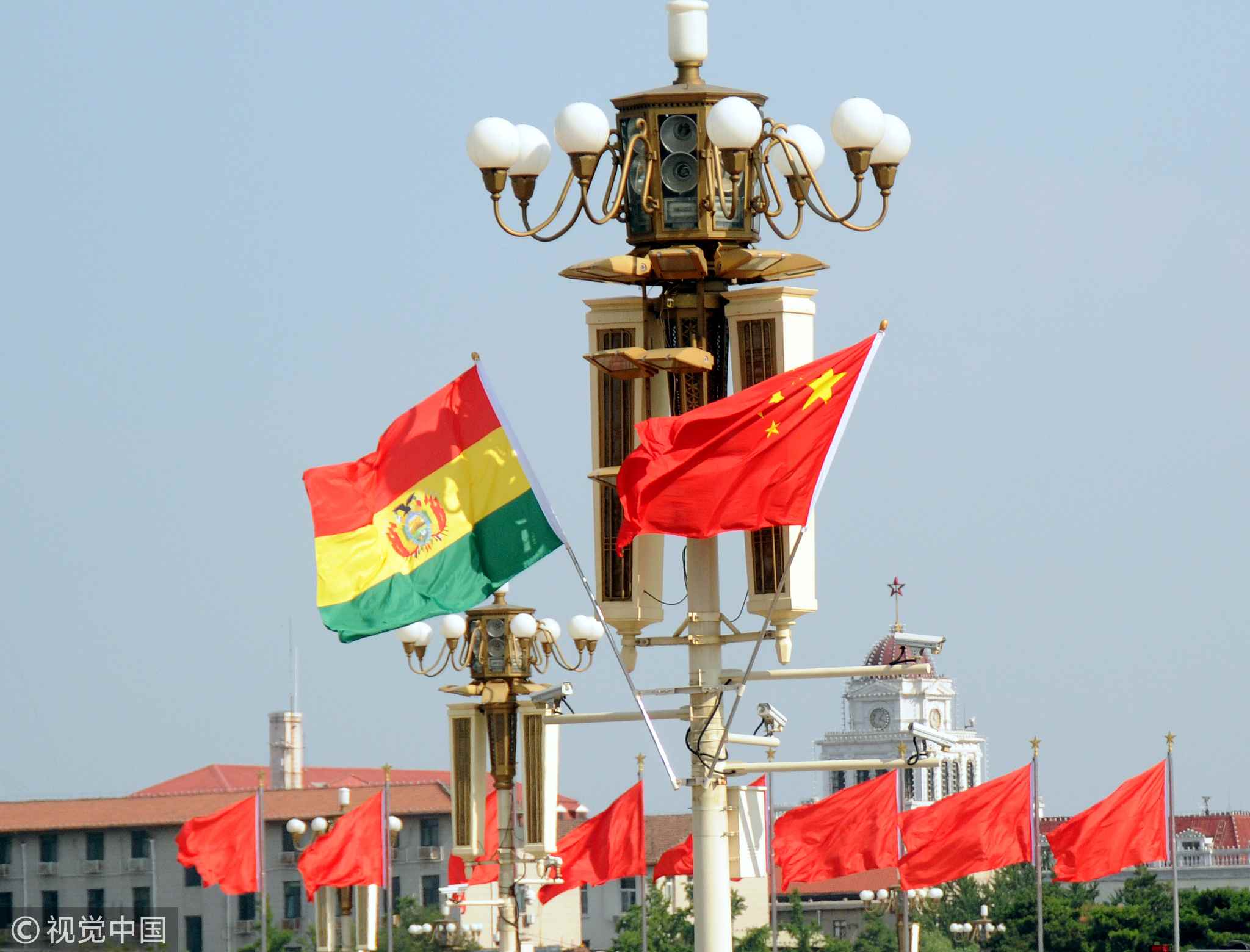National flags of China and Bolivia waving at the Tiananmen Square during Bolivian President Morales' state visit to China, Beijing, June 19, 2018. /VCG Photo.