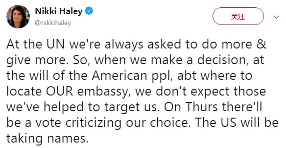 US Ambassador to the UN Nikki Haley tweets on December 19, 2017. /Twitter Screenshot