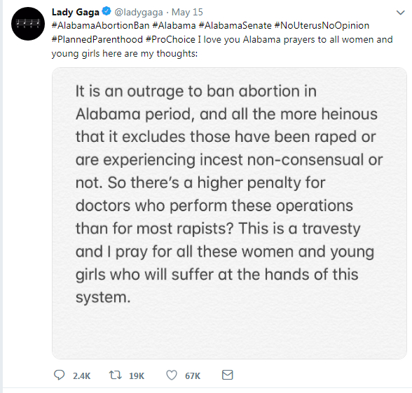 Singer Lady Gaga called the bill "an outrage" and "heinous" in a tweet. "So there's a higher penalty for doctors who perform these operations than for most rapists?" she posted.