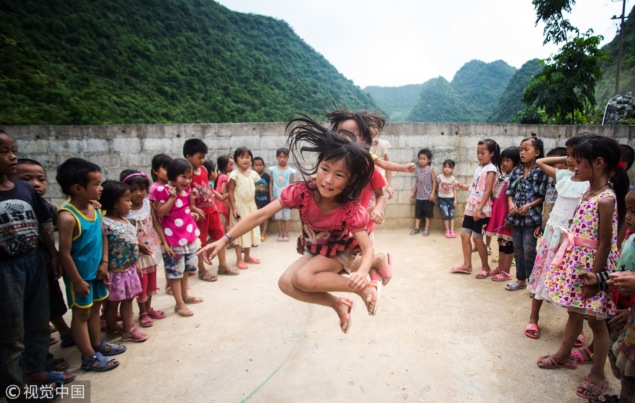 Meng Yiping (far R), a left-behind child who lives with her grandparents, watches classmates skip rope at the Chongshan Primary School in the town of Longfu Township, in south China's Guangxi Zhuang Autonomous Region. /VCG Photo