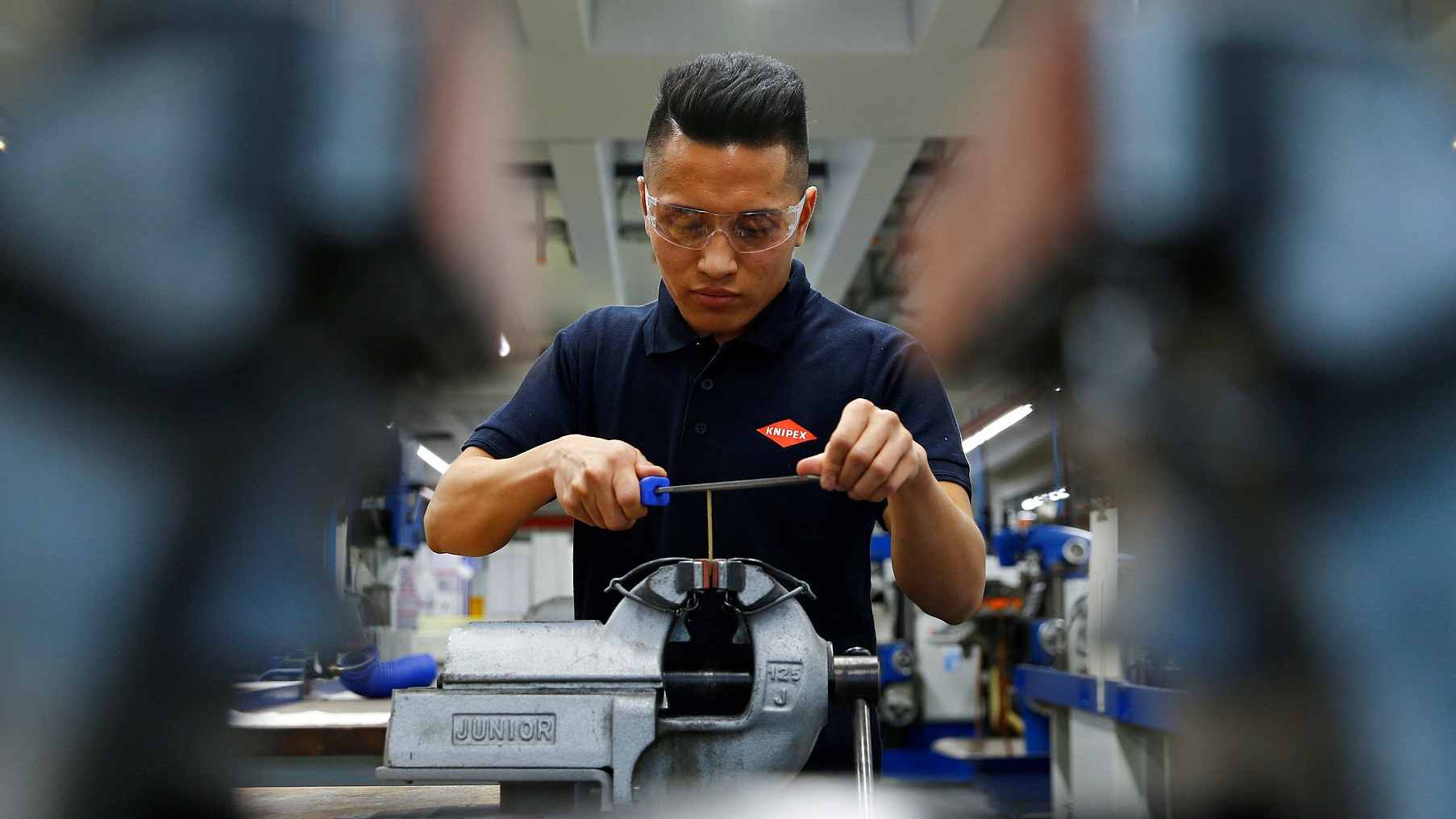 (Cover photo: Ahmad Hosseini, an 18-year-old trainee and former refugee from Afghanistan, is pictured through a plain vice at the training workshop in Wuppertal, western Germany. /VCG Photo )