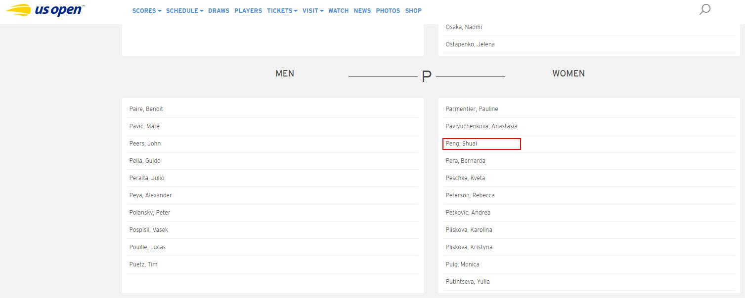 Peng Shuai is on the list of US Open while she has been banned from now on. /Screenshot from US Open official website.