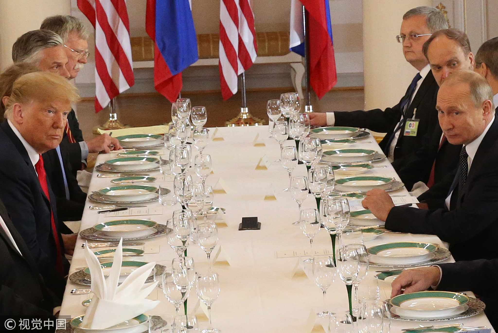 US President Donald Trump (L) and Russian President Vladimir Putin attend a dinner in Helsinki, Finland, July 16, 2018. /VCG Photo