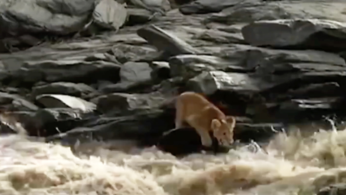 This tiny lion cub attempted to cross a fearsome river. Its older sibling leaped effortlessly across. But the brave cub fell into the rapid torrent, disappearing under the water. Fortunately, it managed to swim to the river bank and climb to safety.