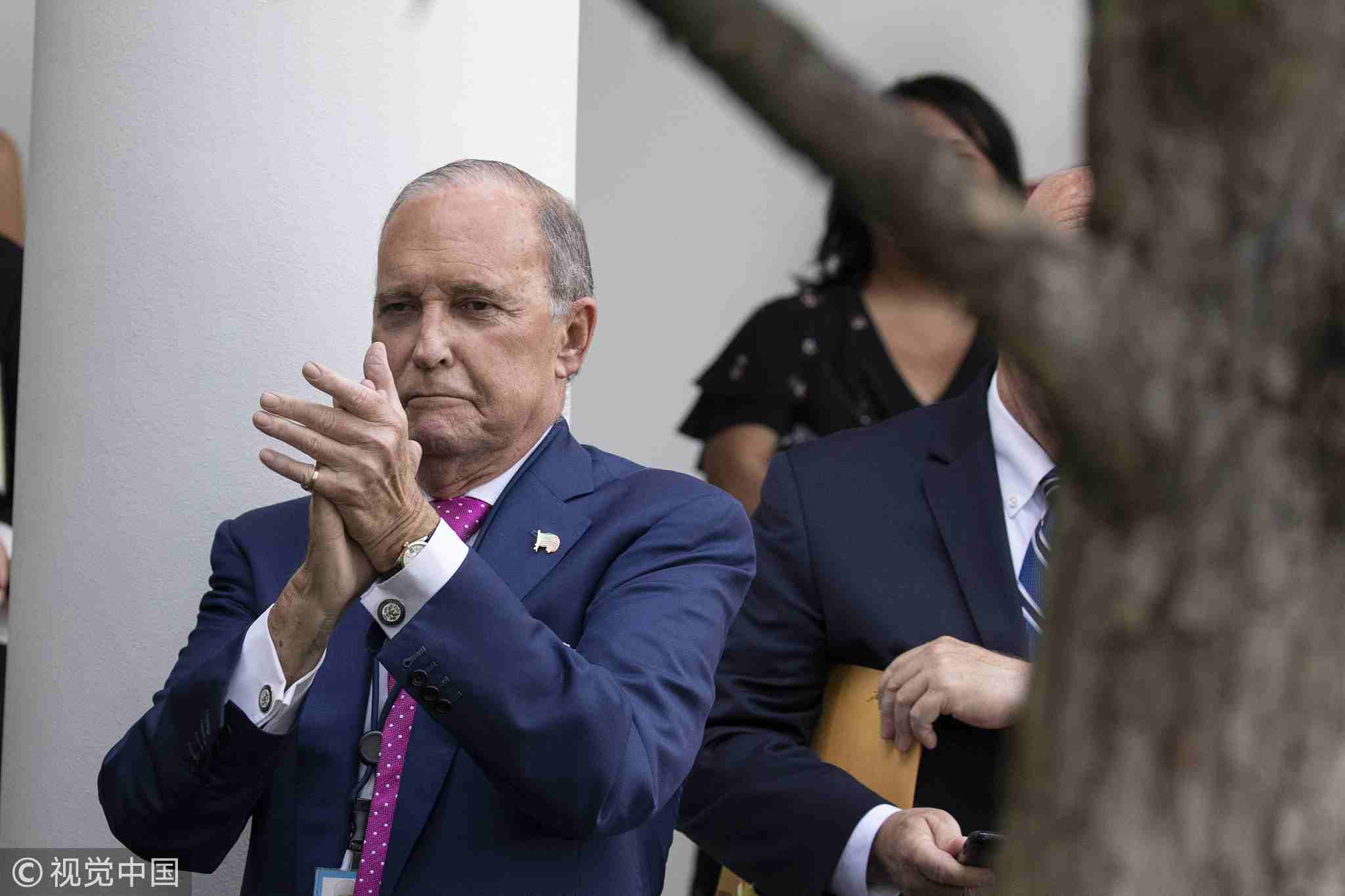 Director of the US National Economic Council Larry Kudlow claps as US President Donald Trump speaks during a joint press conference with the President of the European Commission Jean-Claude Juncker in the White House Rose Garden in Washington, DC, July 25, 2018. /VCG Photo