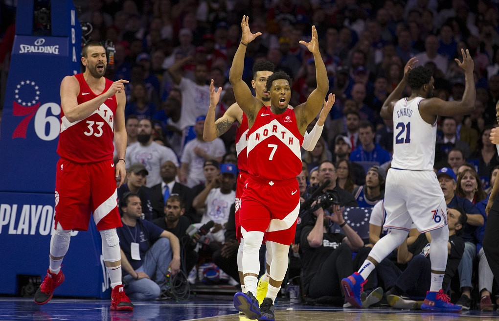 Kyle Lowry #7 and Marc Gasol #33 of the Toronto Raptors in the game they win against the Philadelphia 76ers 101-96 at the Wells Fargo Center, May 5, 2019. /VCG Photo