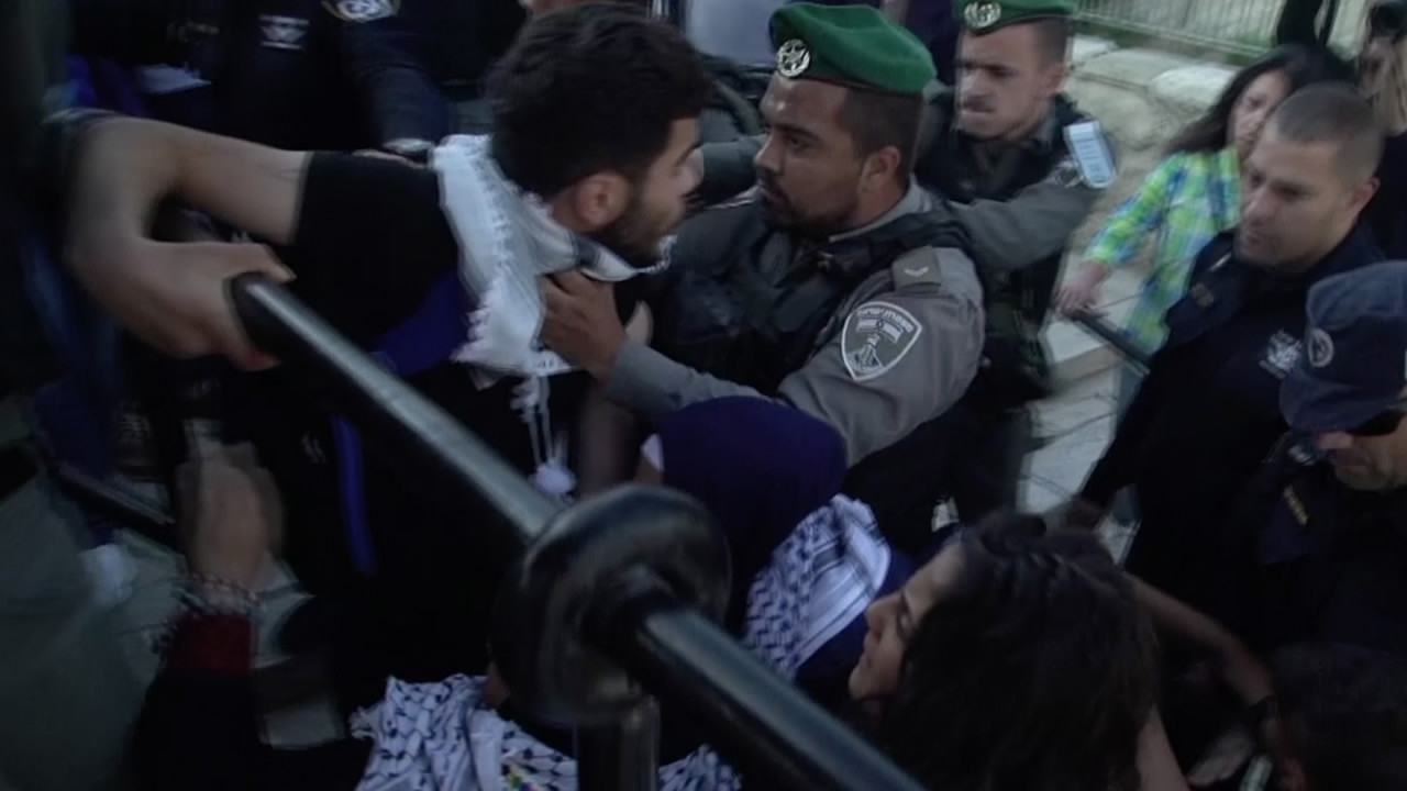 Israeli border police forces and Palestinian protesters clashed near Jerusalem's Damascus Gate on Tuesday. Demonstrators had gathered at the square outside the gate as part of Nakba Day protests.