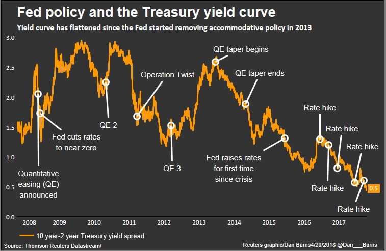 Minneapolis Fed President Neel Kashkari, who consistently voted against rate hikes last year, said in a CNBC interview on Friday that the flattening curve was “a yellow light flashing,” a warning that the Fed should soon stop raising rates or risk braking the economy too quickly and plunging the country into recession.
