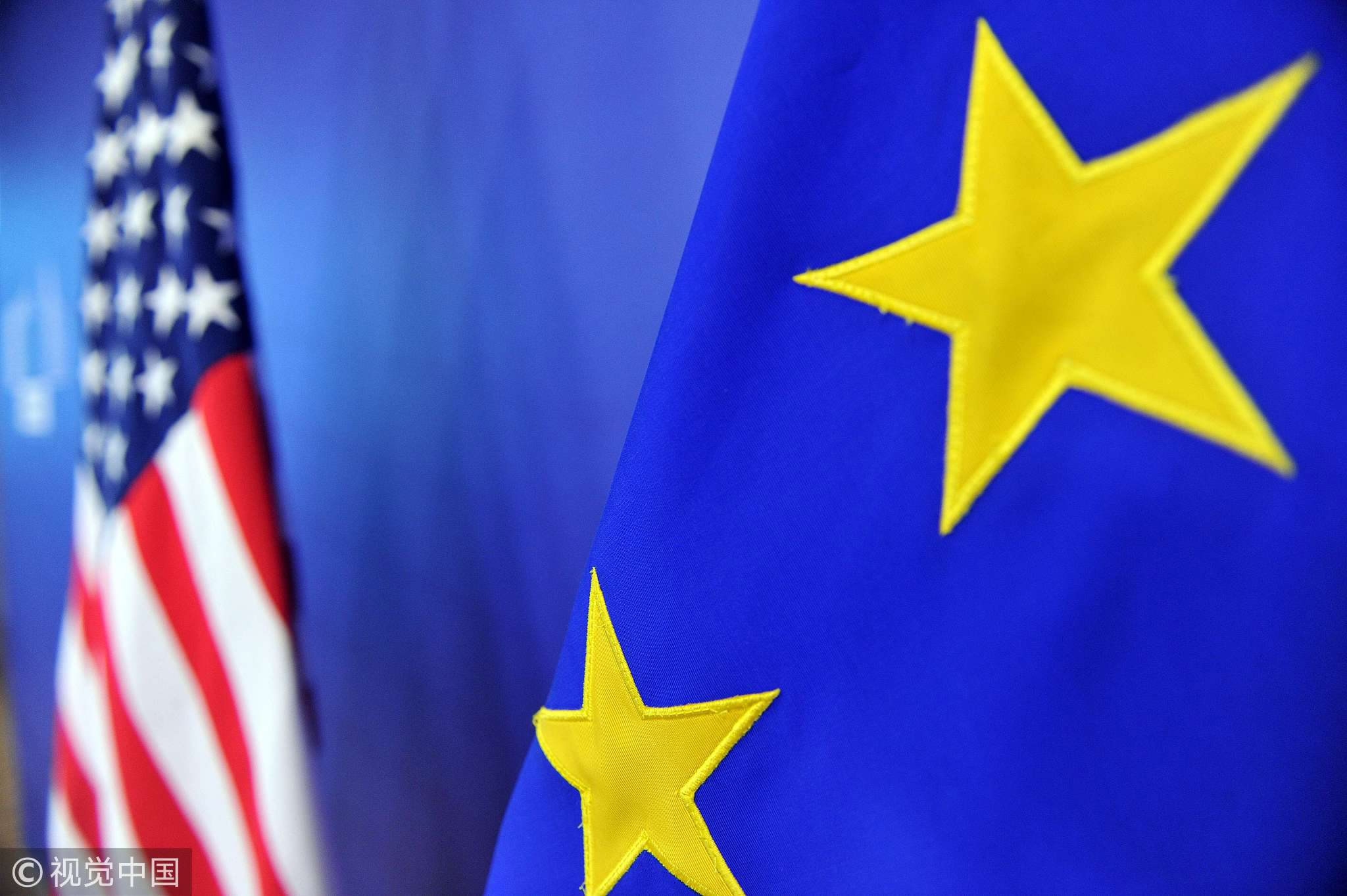 The European Union and the US flags are seen at the EU Headquarters in Brussels. /VCG Photo