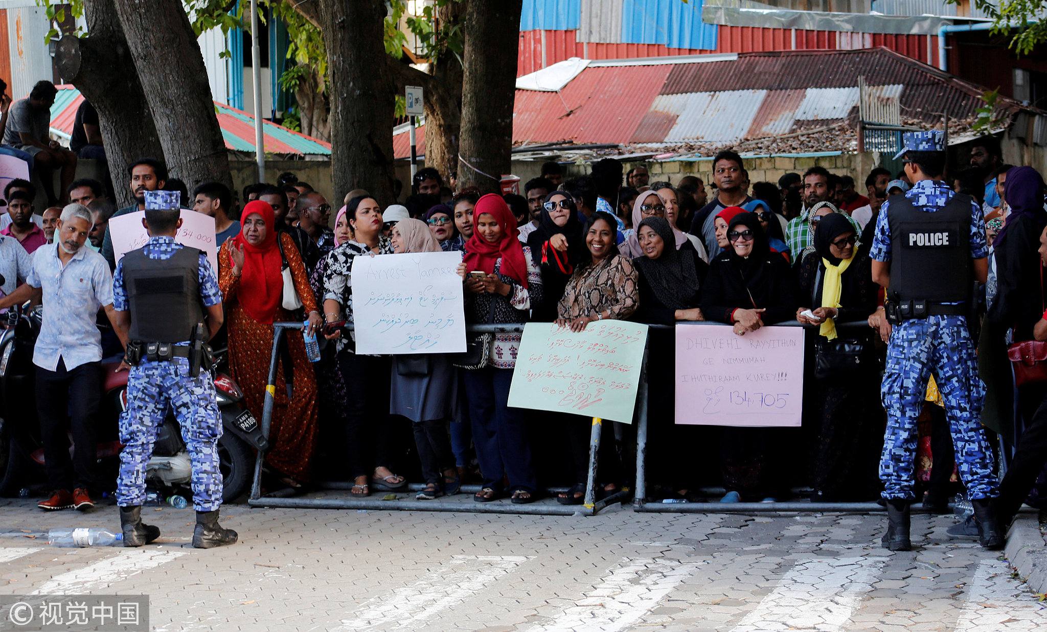 Maldives opposition supporters protest demanding the arrest of defeated President Abdulla Yameen as the Supreme Court of the Maldives began to hear a petition challenging the outcome of last month's election in Male, Maldives, October 14, 2018. /VCG Photo