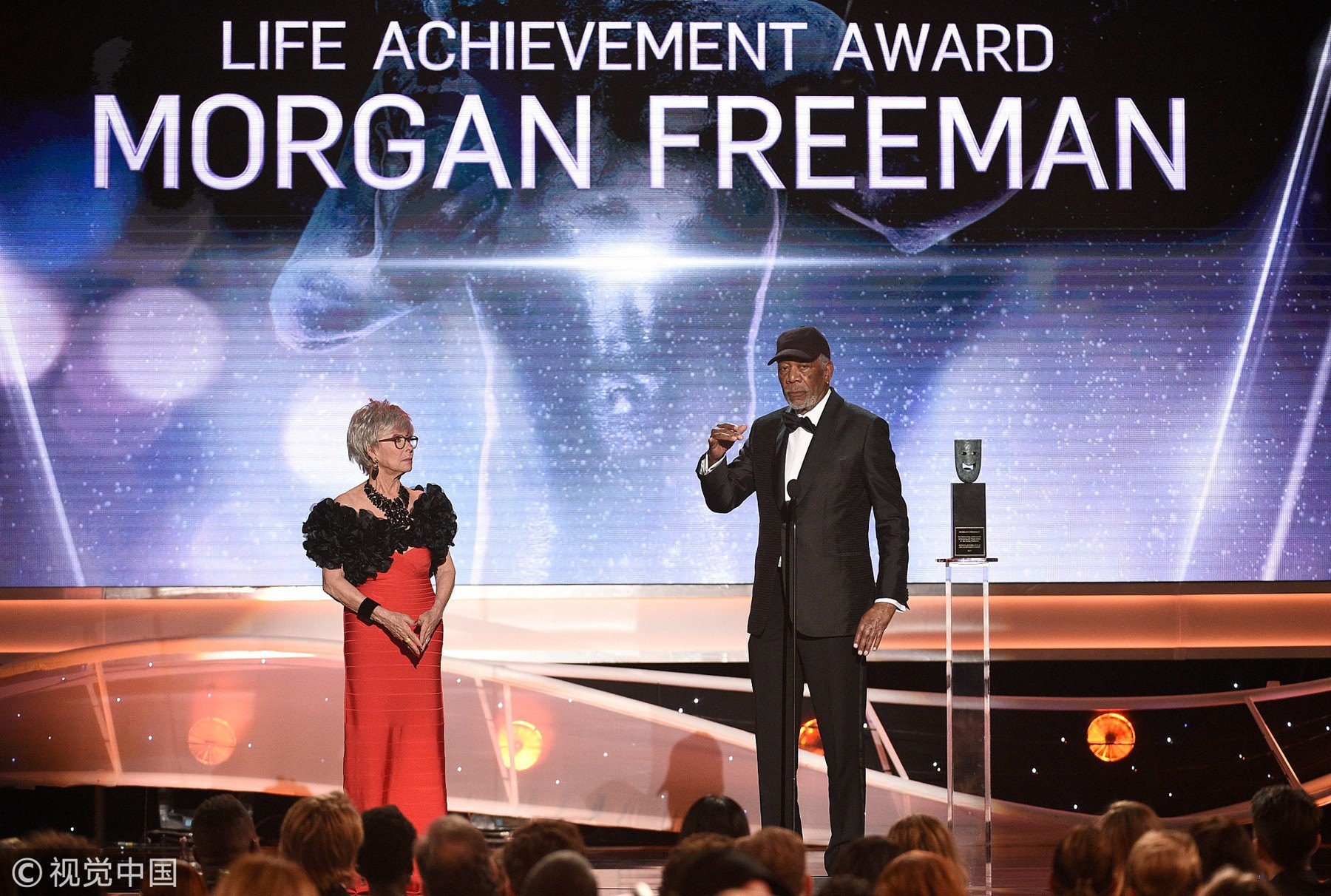 Actress Rita Moreno (L) and honoree Morgan Freeman onstage during the 24th Annual Screen Actors Guild Awards at The Shrine Auditorium on Jan. 21, 2018 in Los Angeles, California. /Photo by Kevork Djansezian/Getty Images/VCG
