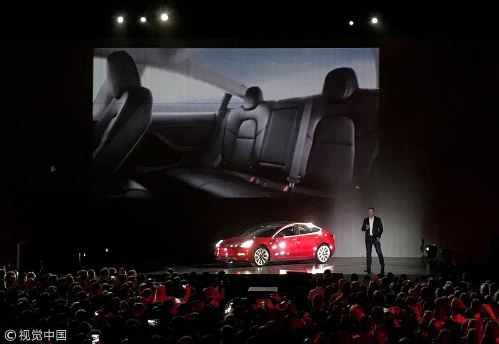 Tesla Chief Executive Elon Musk introduces one of the first Model 3 cars off the Fremont factory's production line during an event at the company's facilities in Fremont, California, US, July 28, 2017. /Photo via VCG