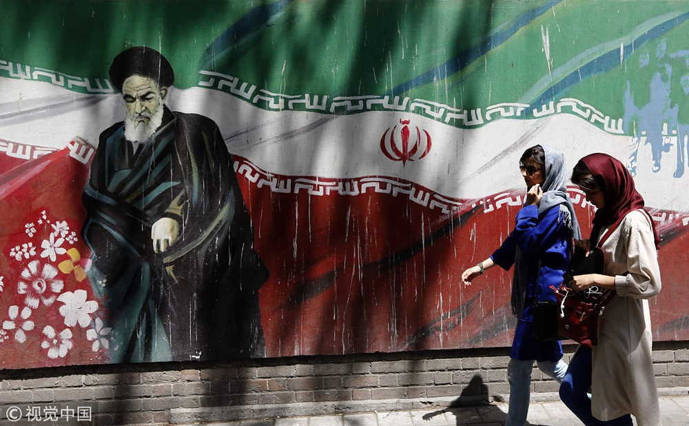 Iranians walk by mural painting of the founder of the Islamic Republic Ayatollah Ruhollah Khomeini on the wall of the former US embassy in Iranian capital Tehran, August 7, 2018. /VCG Photo