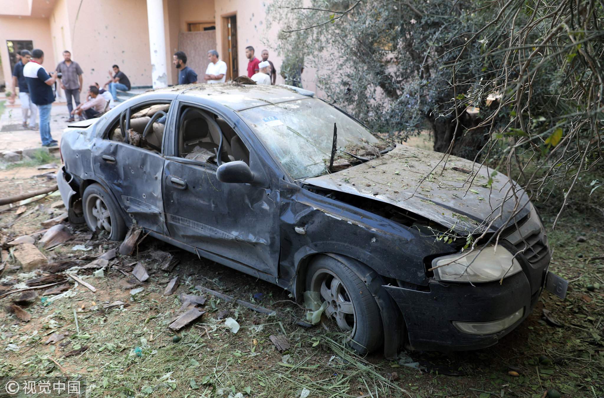 A damaged car is seen during clashes between rival factions in Tripoli, August 30, 2018. /VCG Photo