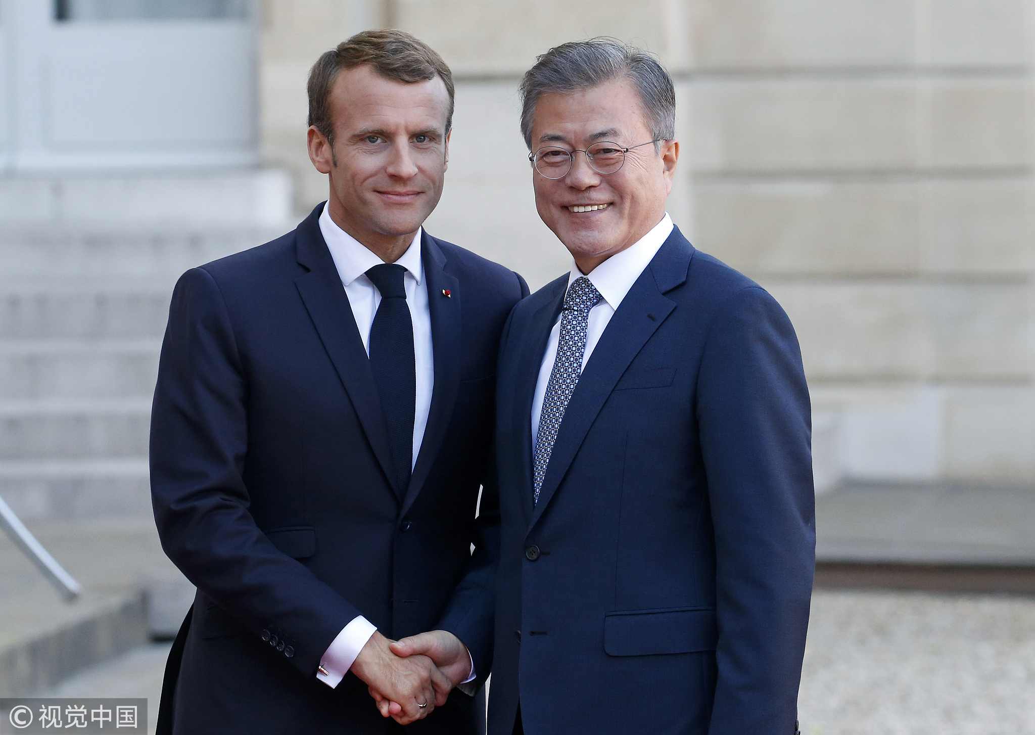 French President Emmanuel Macron (L) welcomes ROK President Moon Jae-in prior to their meeting at the Elysee presidential palace in Paris, October 15, 2018. /VCG Photo