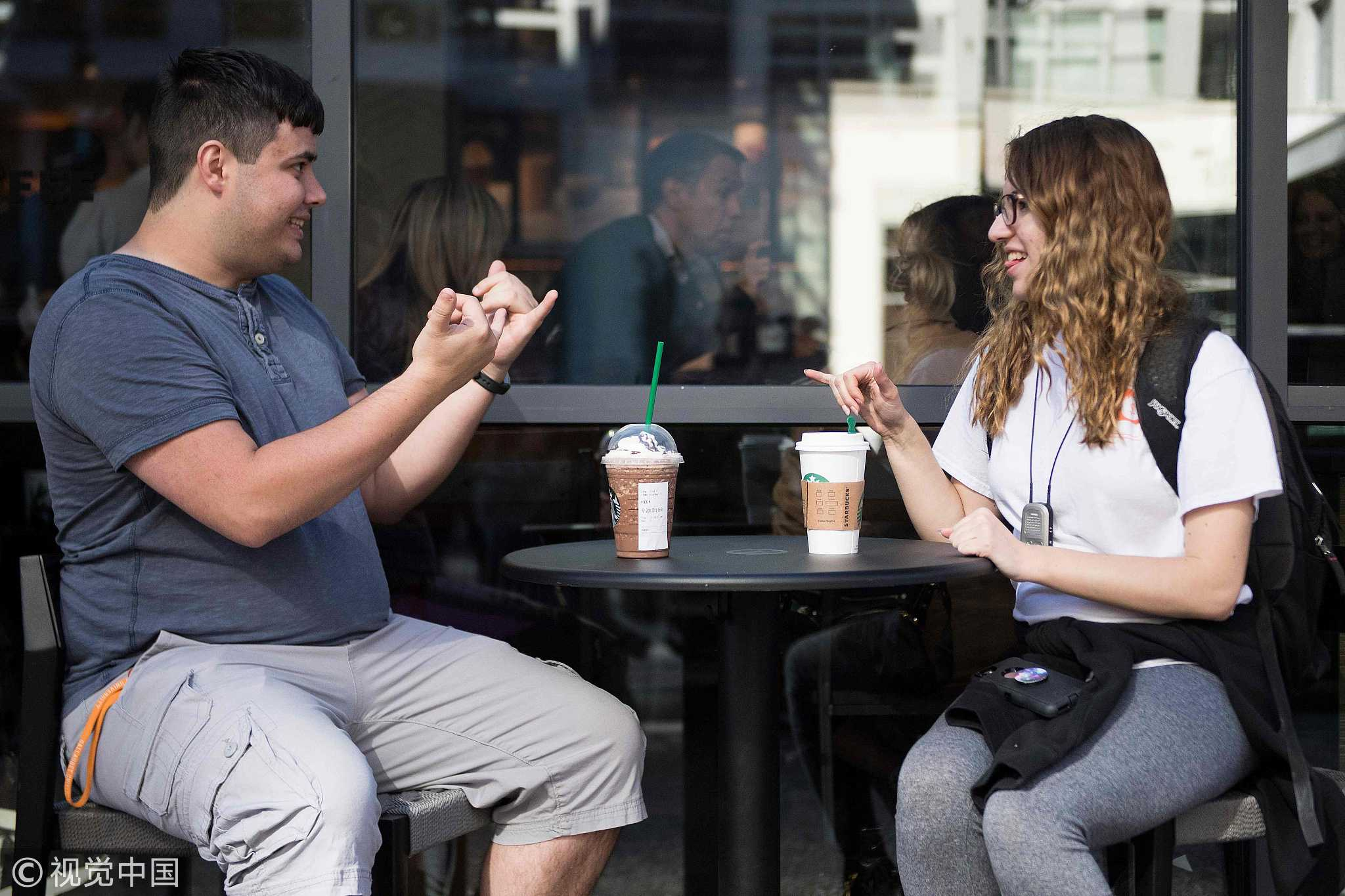 Sign language interpretation major student Nikolas Carapellatti (L) signs with deaf Gallaudet University student Rebecca Witzofsky outside the first US ASL Starbucks cafe in Washington, DC, on October 23, 2018. /VCG Photo