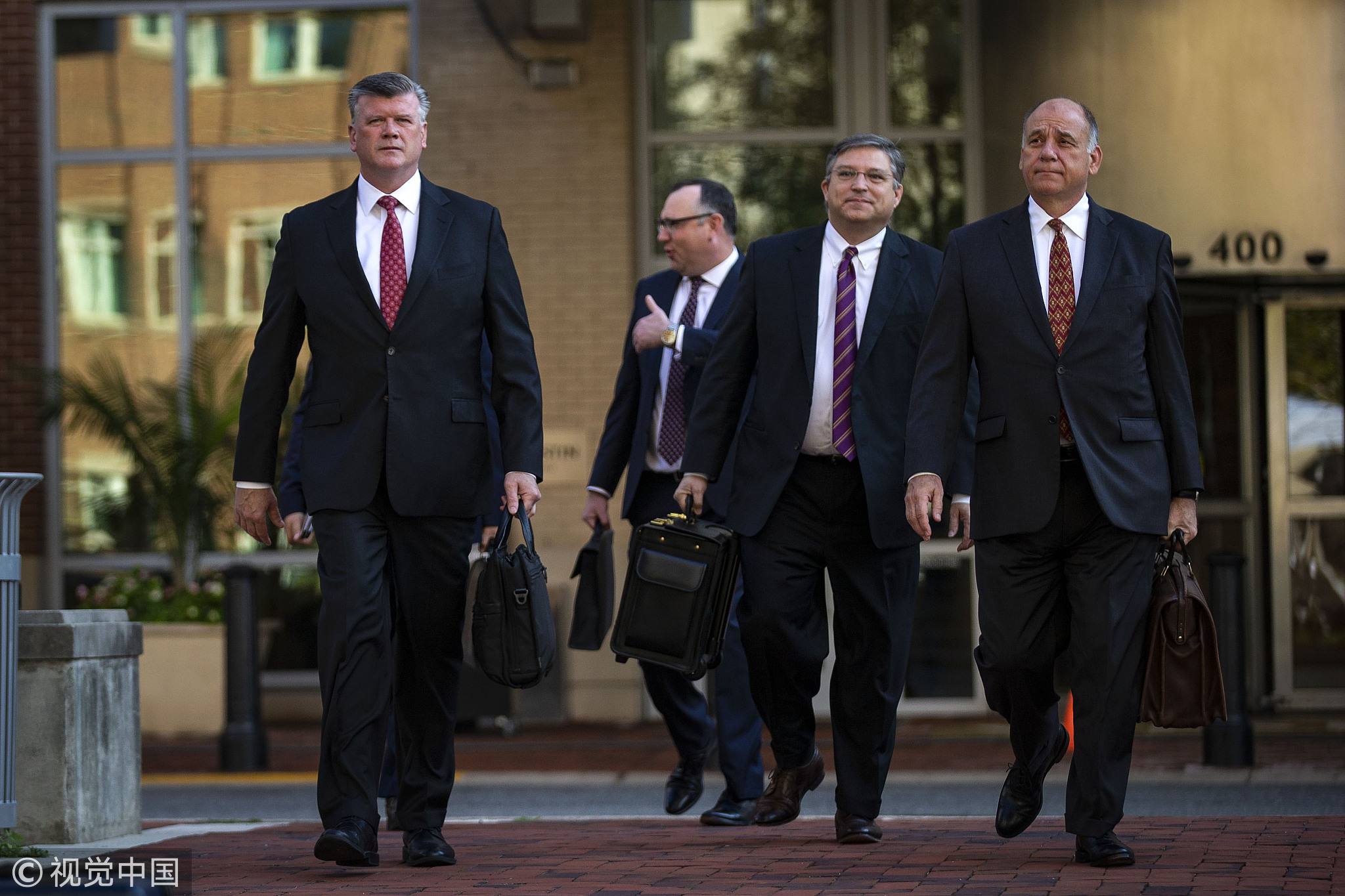 Kevin Downing, the lead lawyer for former Trump Campaign Manager Paul Manafort, from left, Brian Ketcham, the lawyer for Manafort, Richard Westling, co-counsel for Manafort, and Thomas Zehnle, co-counsel for Manafort, arrive at District Court in Alexandria, Aug. 14, 2018. /VCG Photo