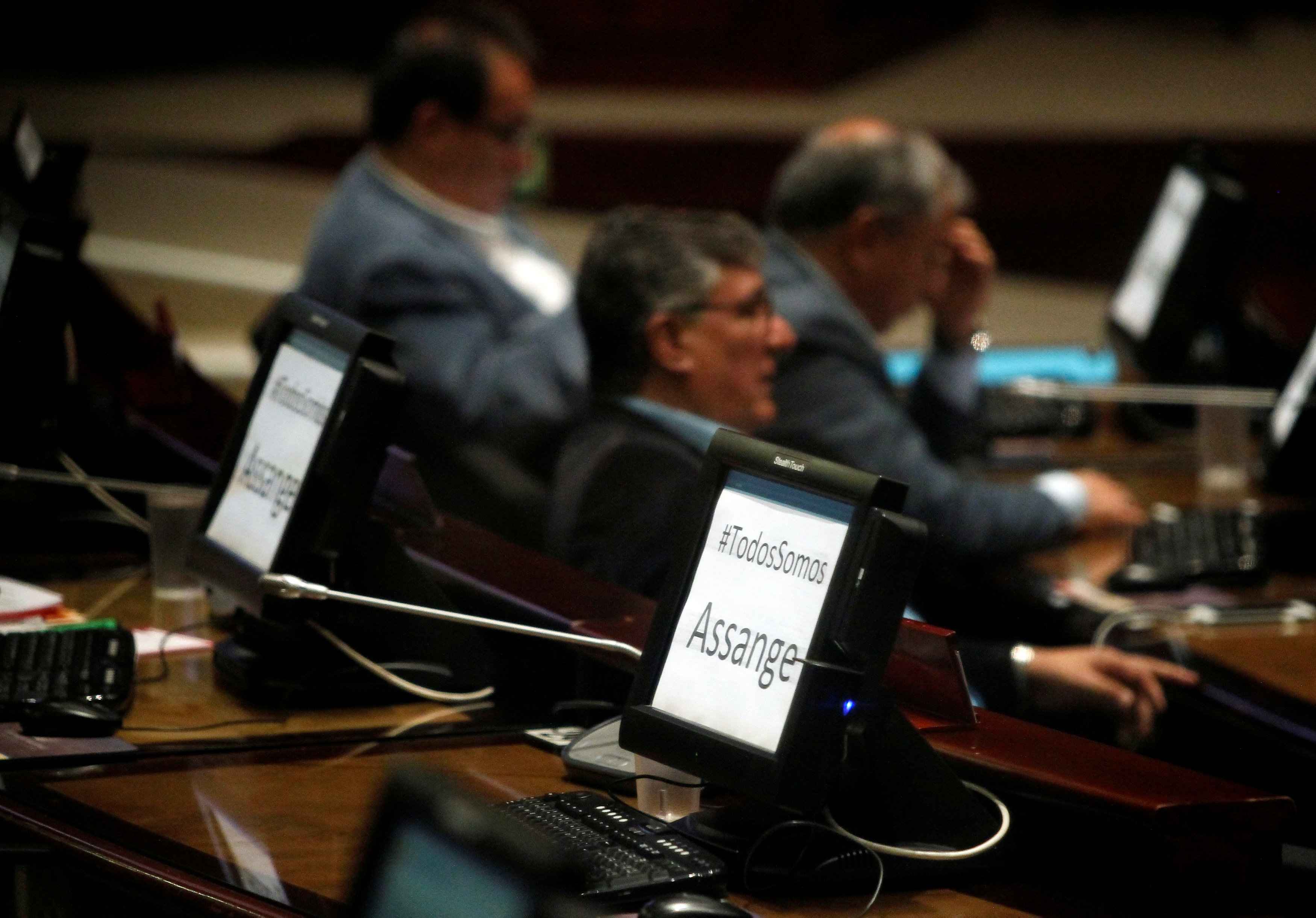 Computer screens show "#We all are Assange" as Ecuador's Foreign Minister Jose Valencia (not pictured) addresses lawmakers at the National Assembly, after WikiLeaks founder Julian Assange was arrested by British police at the Ecuadorean embassy in London, in Quito, Ecuador, April 11, 2019. /Reuters Photo