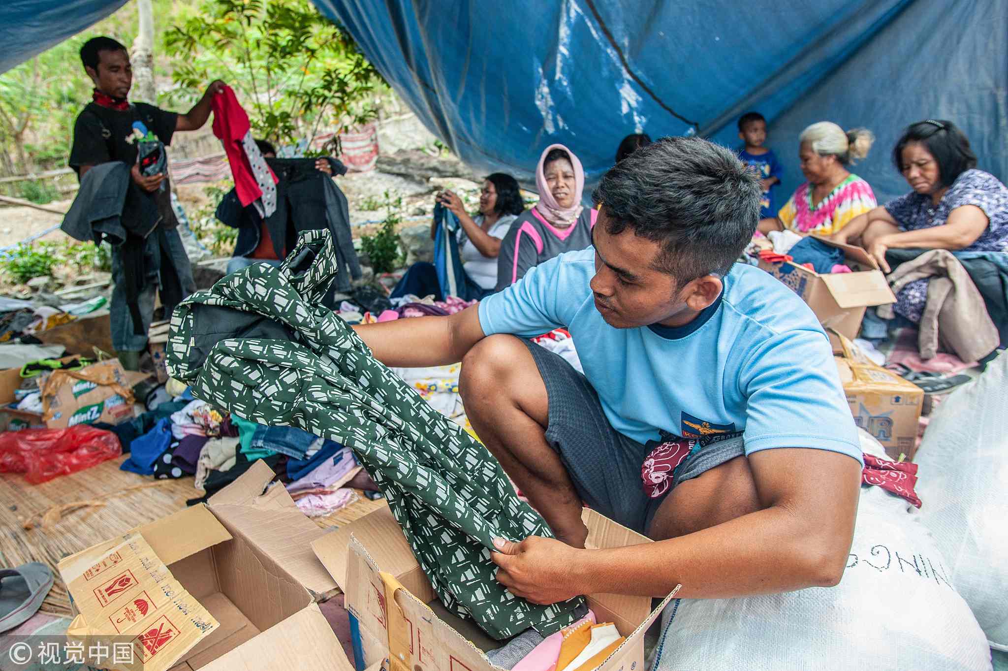 Earthquake victims are seen choosing relief clothes at one of the posts set up by NGOs, October 7, 2018. /VCG Photo