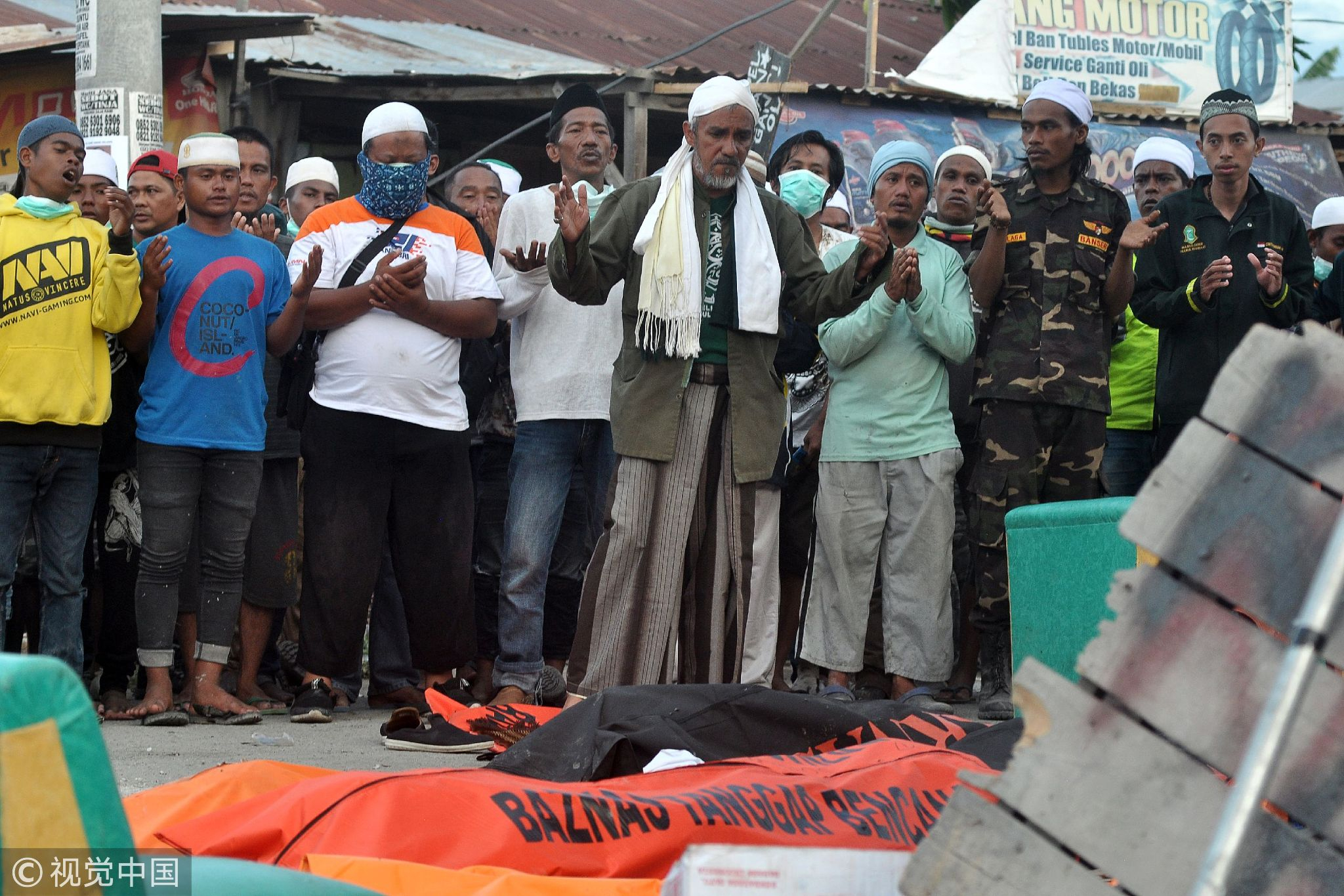 Indonesian Muslims, who also volunteer during the search and rescue operations, pray for the dead bodies they found at the Balaroa village in Palu, October 7, 2018. /VCG Photo