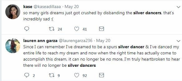 And @laurengarza236 commented “Since I can remember I've dreamed to be a Spurs silver dancer & I've danced my entire life to reach my dream and now when the right time has actually come to accomplish this dream, it can no longer be no more, I'm truly heartbroken to hear there will no longer be silver dancers.”