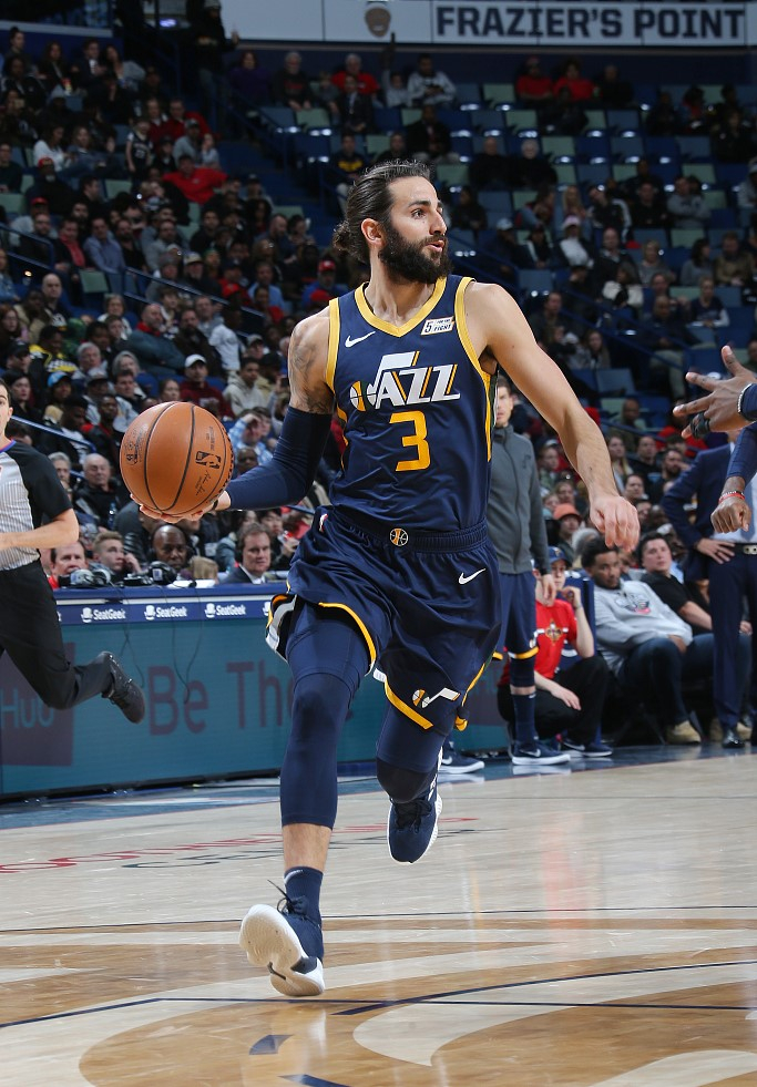 Ricky Rubio, Spanish guard of the Jazz gets ready to pass in the game. /VCG Photo