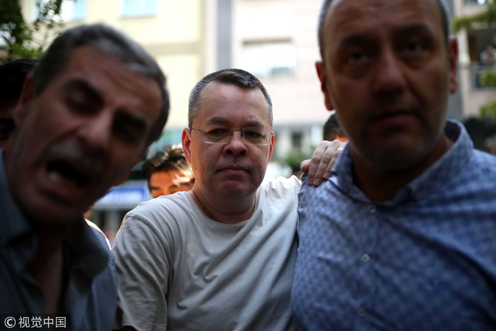 US Pastor Andrew Craig Brunson (C), is seen escorted by Turkish plainclothes police officers as he arrives at his house in Izmir, Turkey, July 25, 2018. /VCG Photo