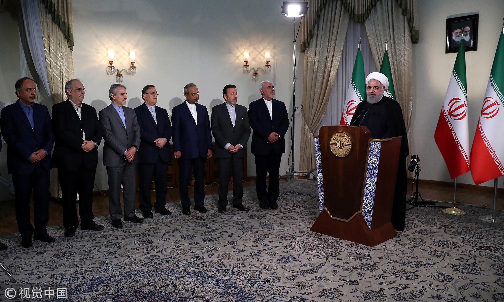 Iran President Hassan Rouhani standing near members of his government while giving a speech on Iranian TV in Tehran after the US announced withdrawal from the Iran nuclear deal, May 8, 2018. /VCG Photo