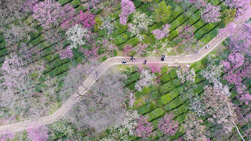 As temperatures rise and spring nears in China, plum blossoms are in full bloom in east China’s Nanjing City, Jiangsu Province. On Sunday, visitors were seen walking across the field of flowers. /VCG Photo
