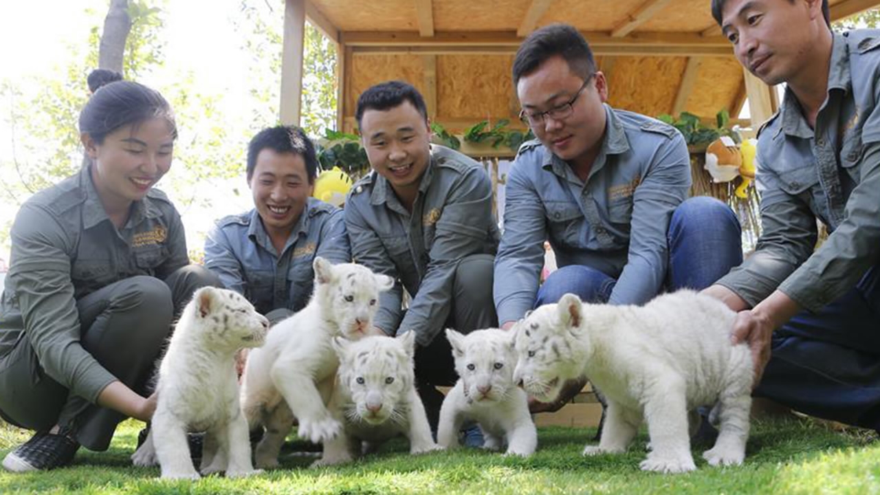 Snow tiger quintuplets born last month have made their first public appearance at Jinan Wildlife World in east China's Shandong Province.